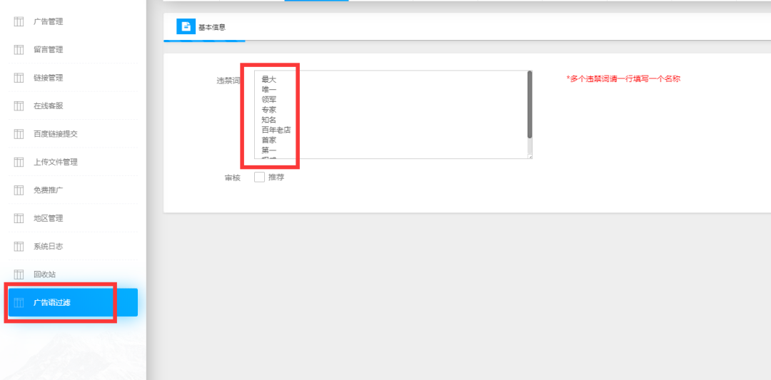 廣告法規定越來越嚴格,廣告詞成了企業的不敢碰觸的“炸彈”。對此,此次“萬家燈火CMS系統”的升級,可在編輯框中自定義自己領域中的違禁詞,讓網站遠離“危險”更安全。