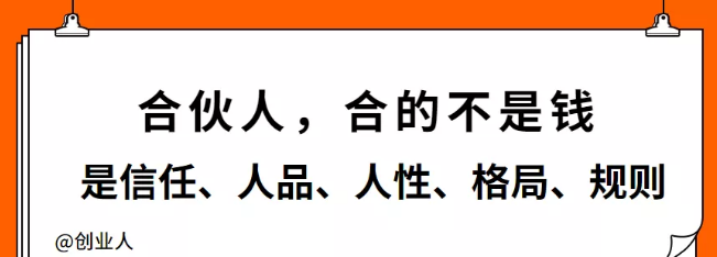 合伙人,合的不是錢,而是信任、人品、人性、格局和規則。創業,本就是九死一生,不要看到喬布斯、馬云、馬化騰、雷軍等等,就以為創業是“九生一死”,在這一個個成功光環被無限放大的背后,是眾多大街小巷、寫字樓里,每天都在破產、倒閉、失敗、痛苦,甚至絕望的人。