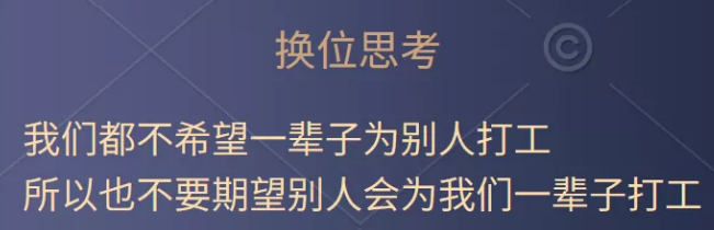很多中小民營企業,往往是老板一股獨大,不愿意與別人合作,也不愿與別人分享,只是希望員工為自己打工,還希望員工一輩子死心塌地的為企業付出,有的老板總和我抱怨為什么人才培養好了人就跑了,我會問他:“你當時為什么要從別人家出來自己創業?”當我們都不希望一輩子為別人打工的時候,我們也不要期望別人會為我們一輩子打工,換位思考我們往往會找到問題的答案。