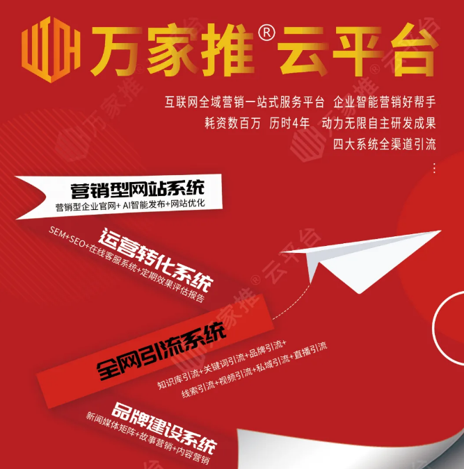 萬家推®云平臺是互聯網全域營銷一站式服務平臺,為企業提供搭平臺(三屏響應式 打通微信 百度小程序 十網合一)、引流量(搜索引擎獲客 知識獲客 AI速推站群獲客 商盟B2B獲客)、建品牌、代運營(一問一答 視頻 軟文 AI速推)、促轉化(鵲橋微信獲客)、看效果的全域營銷一站式服務,助力企業快速打開互聯網營銷新市場。