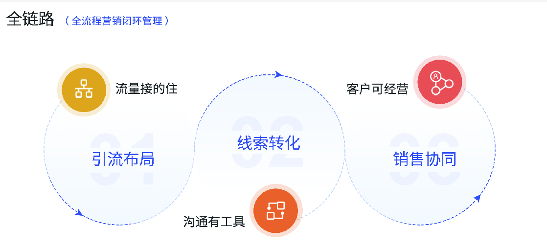 全鏈路指的是萬家推®云平臺通過引流布局、線索轉化、銷售協同三個階段,實現全流程營銷閉環管理,讓全鏈路流量轉化更輕松、更直接。