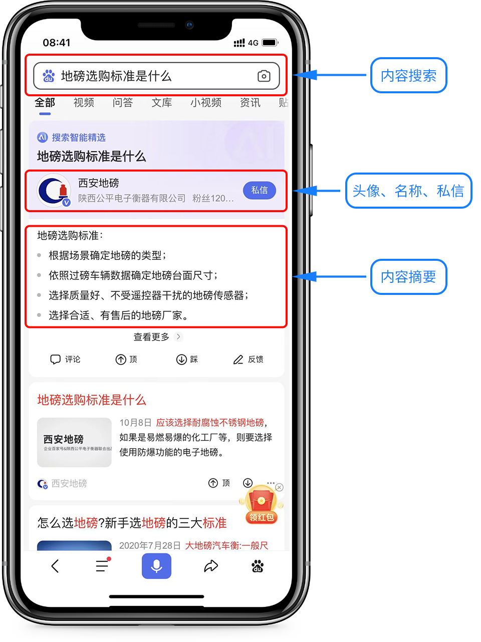 企業(yè)頭條的搜索結(jié)果是以卡片專區(qū)的形式展示在百度移動端首頁。展示形式為:問答搜索→標(biāo)題→藍(lán)V標(biāo)識的頭像、百家號名稱、私信→內(nèi)容摘要。