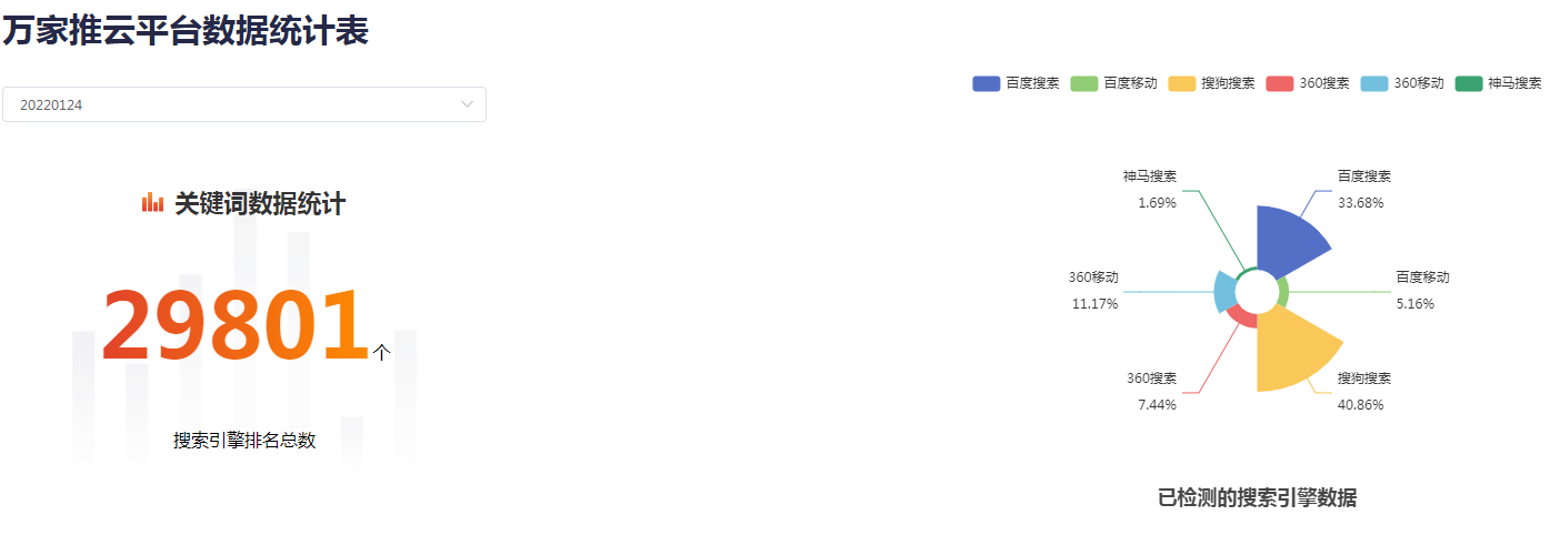 鑫歐建筑在萬家推云平臺助力下,走穩了互聯網轉型之路。截止目前,關鍵詞總數達29801個,官網優化排名、視頻營銷等多個模塊的關鍵詞均在搜索引擎首頁展示,順利打響了品牌*度。